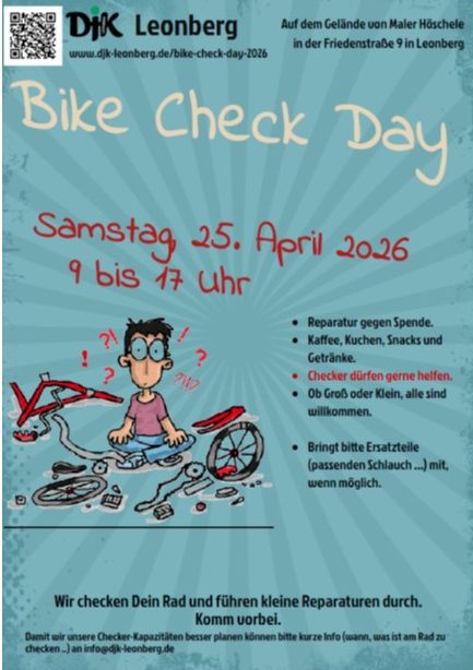 Am Samstag, 25. April 2026, lädt die DJK Leonberg zum Bike Check Day ein. Von 9 bis 17 Uhr dreht sich auf dem Gelände von Maler Höschele in der Friedenstraße 9 in Leonberg alles rund ums Fahrrad: Checker prüfen Räder, führen kleinere Reparaturen durch und machen Groß und Klein fit für die neue Radsaison.